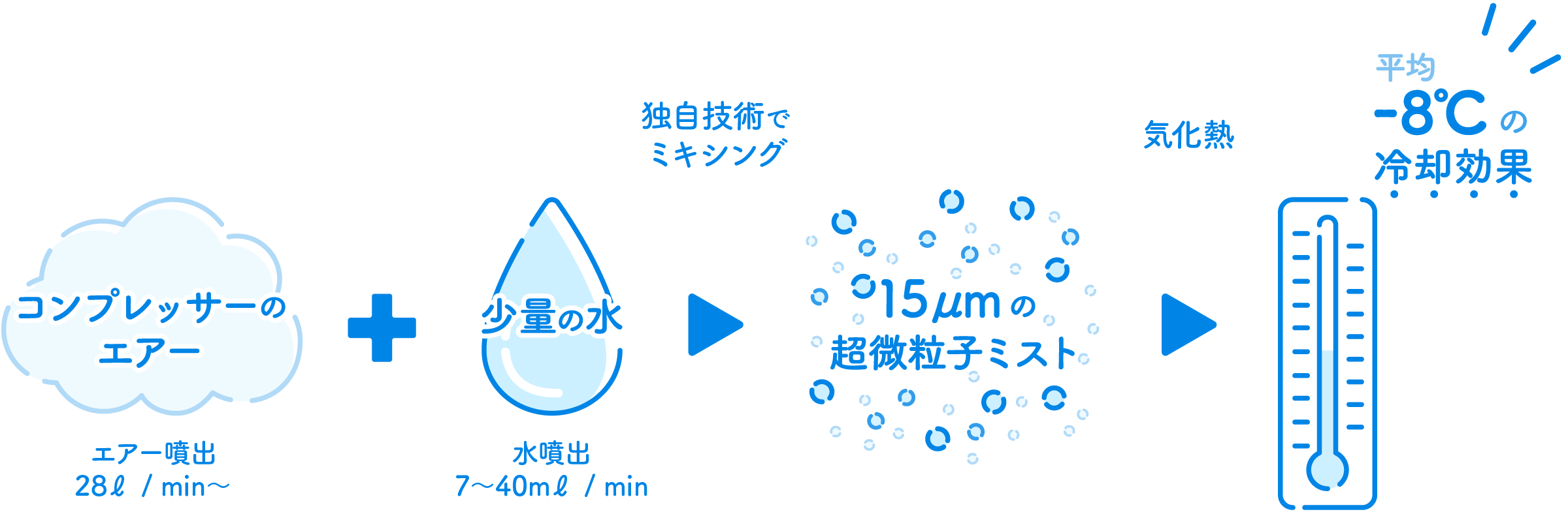 圧縮空気(28ℓ/分)と水(7ℓ〜40ℓ/分)のみで、周囲の気温を最大8℃低下させます。